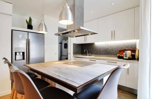 Upon entering this apartment, guests are greeted by a luminous living/dining area adorned with contemporary furnishings. The expansive double-paned French windows offer a picturesque view of the bustling Parisian street life below, suffusing the space with natural light.