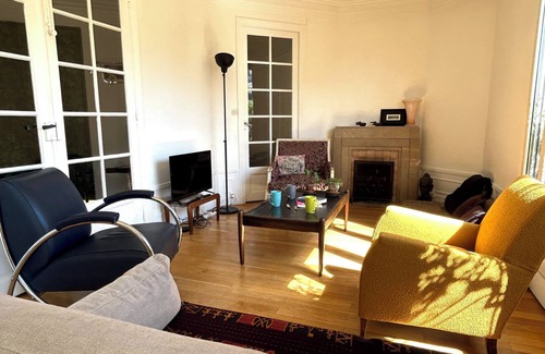 In a beautiful typically Parisian building, magnificent apartment of 110m2 for maximum 4 people, on the 6th floor with elevator. Large beautiful bedroom with a large comfortable bed and a large closet. Large bright living room with a lovely view over the rooftops of Paris, with a sofa bed for 2 people, a large dining table, and a desk area. Balcony accessible from the living room. The bathroom has a large bathtub and the toilet is separate from the bathroom. The kitchen is fully equipped with fridge, microwave, oven, coffee machine, toaster, hob and dining table. Very pleasant apartment to live in Parisian style.