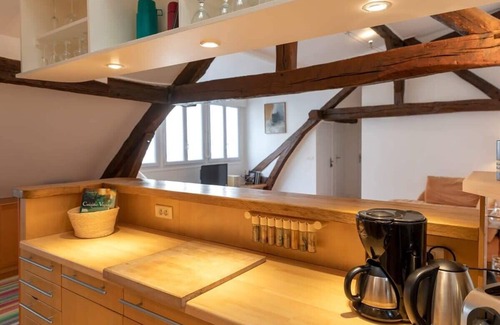 Upon entering, you’ll be met by the large living room which has lofted ceiling with beautiful exposed beams and flat-screen TV. The open adjacent kitchen is fully equipped with stainless steel appliances and porcelain dinnerware. There is a bar for four and a dining table for six guests. The master bedroom has a queen-size bed and there is a bathroom across the hall. The bathroom was recently refurbished and has a large walk in shower, bidet and WC. The whole apartment is located on a quiet courtyard with a charming antique shop below.