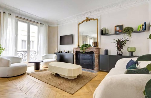 The living room offers a serene and chic environment to unwind. A plush sofa, elegant armchairs, and a large flat-screen TV make it the perfect spot for relaxing evenings or entertaining guests after a day exploring the City of Light.